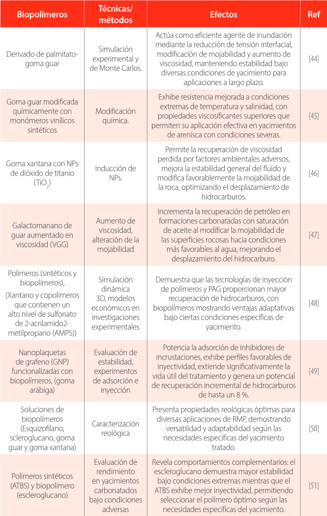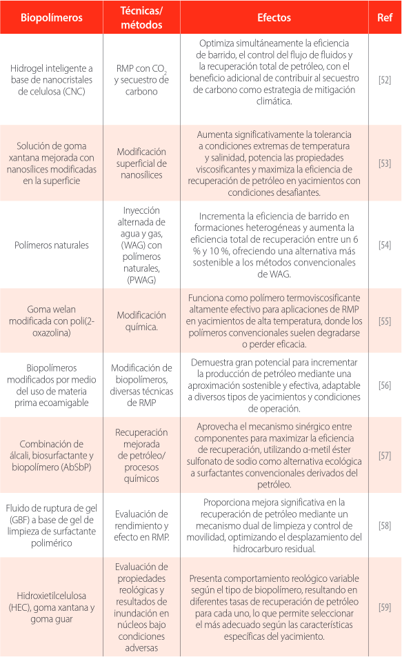 Como se muestra en la Tabla 1, son cada vez más los estudios desarrollados enfocados en demostrar que los biopolímeros y nanomateriales pueden mejorar la recuperación de petróleo en comparación con los métodos convencionales.