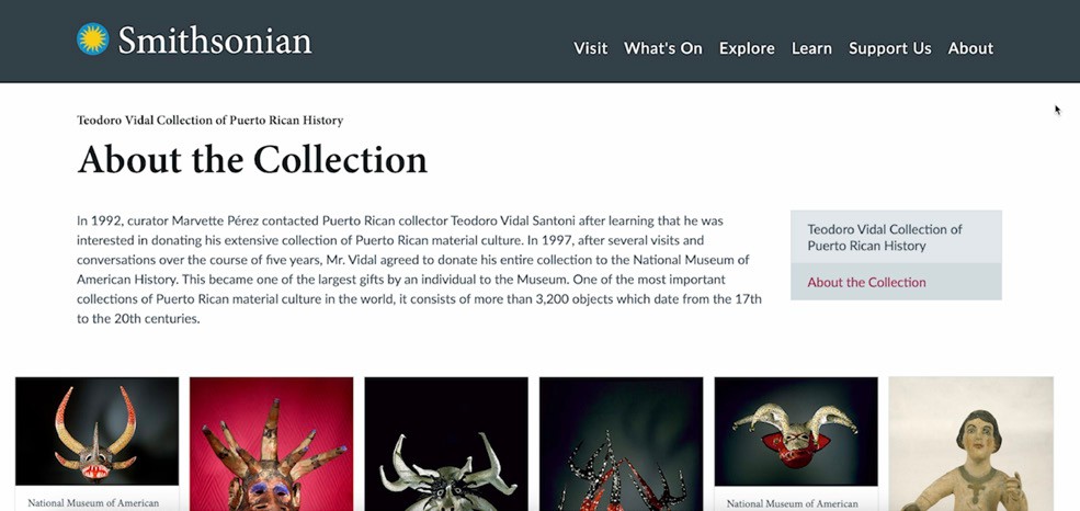 Según su propio testimonio, Vidal coleccionó un país que veía desaparecer como resultado de las políticas del gobierno para el que trabajaba. El país cambió, pero los objetos permanecieron. Y luego, una gran parte de ellos fue a parar al Smithsonian, donde ayudaron a suplir la notoria ausencia de representación latina en la institución. Marvette Pérez, la primera curadora puertorriqueña en el Smithsonian, estuvo a cargo de recibir la donación y curar una exposición con la colección, coincidiendo con el centenario de la invasión estadounidense a Puerto Rico.